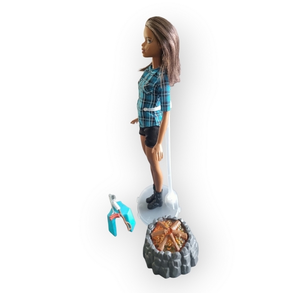 Barbie porte une tenue parfaite pour l’aventure : une chemise à carreaux bleue, un short noir et des bottes assorties.