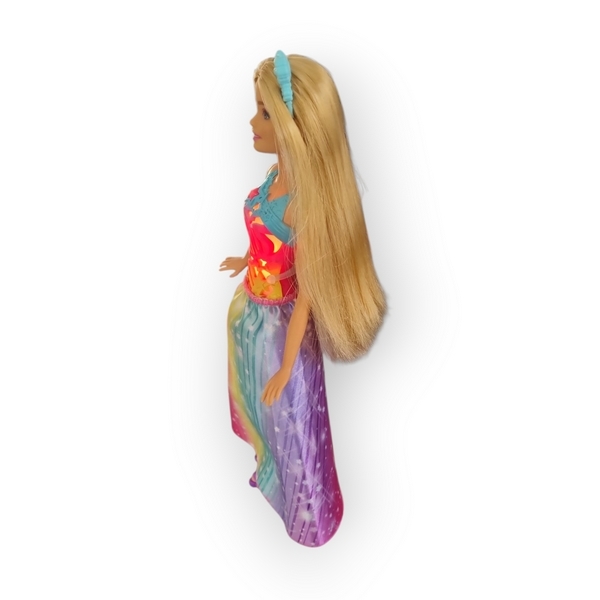 Cette superbe poupée, aux longs cheveux blonds, s’illumine et diffuse de la musique lorsqu’on appuie sur le bouton situé sur son corsage.