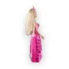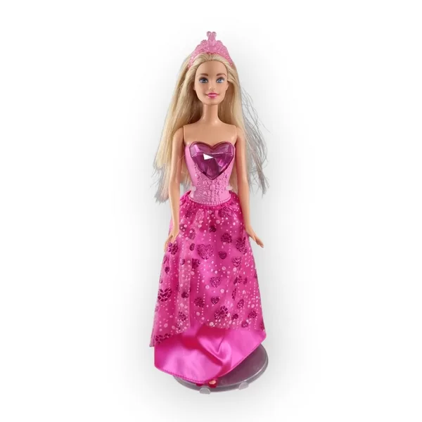 La poupée porte un bustier rose orné d’un cœur scintillant (non détachable), une longue jupe rose amovible avec des motifs à cœurs et un volant transparent pailleté.
