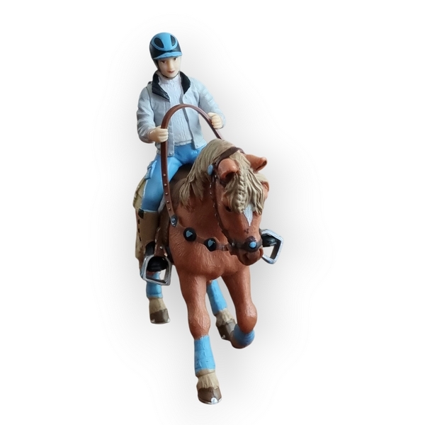 Très élégant avec sa selle bleue et ses bandes assorties, ce cheval met parfaitement en valeur sa robe alezane.