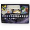 1 loupe, 1 bouteille en plastique, 1 mètre à ruban, 1 pince, des lunettes de protection, 200g de plâtre, des sachets de prélèvement, du papier filtre, 1 entonnoir, de la pâte à modeler, des cartes d’insectes, des planches prédécoupées d’images d’enquêtes, 1 éprouvette, 1 support d’éprouvette, 1 badge de détective, 5 fiches empreintes digitales, des fiches d’enquête, livret détaillé.