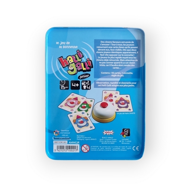Des clowns farceurs ont envie de s’amuser ! Tour à tour, les joueurs retournent une carte clown qu’ils posent devant eux, face visible. Dès que deux clowns joyeux identiques apparaissent, il faut vite appuyer sur la sonnette ! Le joueur le plus rapide reçoit tous les clowns déjà retournés. Mais attention de na pas sonner quand il y un clown triste, car il faudra alors rendre des cartes…