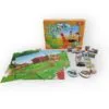 1 règle du jeu, 1 dé en bois, 1 plateau puzzle, 10 jetons (nourriture, production…), 1 jeton « Fermier » en bois, 15 pions animaux en bois, 1 « aide-mémoire » spécial tout petits.
