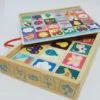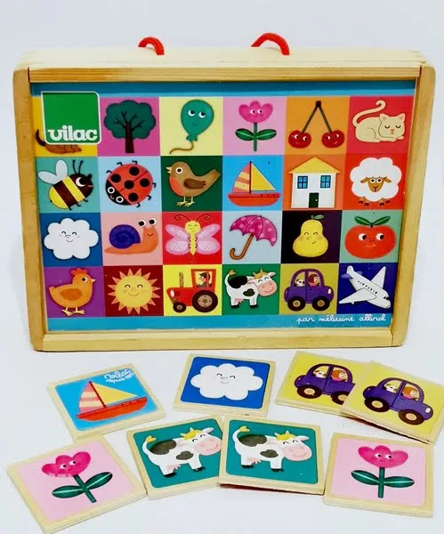 Un jeu de mémo imagier constitué de 48 pièces en bois qui se rangent dans un joli coffret en bois.