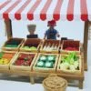 Comprend trois personnages, un étal, huit cagettes pour ranger les produits du marché (choux, panais, poivrons, carottes, œufs…) et des accessoires (panier, caisse enregistreuse, balance…).