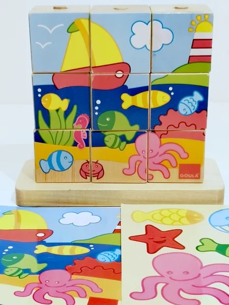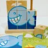 Un joli puzzle vertical de 9 cubes en bois empilables permettant de réaliser 4 illustrations sur le thème de la mer.
