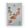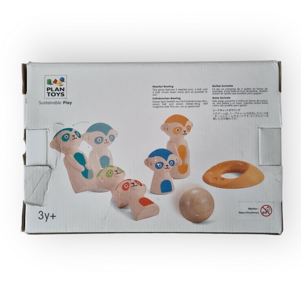 Ce jeu se compose de 5 quilles en formes de suricates, d’une balle et d’un réceptacle.