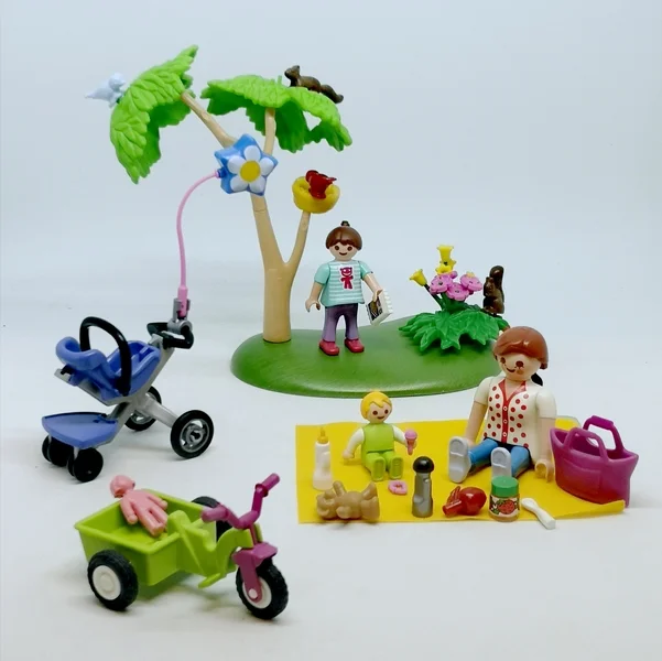 Contient 3 personnages, 2 écureuils, 2 oiseaux, 1 poussette, 1 tricycle, un support avec arbre et fleurs, un tapis pour pique-nique et de nombreux accessoires (sac, poupon, petit pot…)